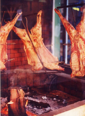 Artist Maria Tuma in Argentina:The Glacier Perito Moreno, behind me in Patagonia, Argentina. February 2003. We visited the Estancia Cristina next to Lago Argentino. Cristina was the daughter of a shepperd who traveled from England to this area which had lots of sheep. The wool industry was a great commodity. Cristina got very ill due to the windy cold winters and died of lung disease. We ate a delicious asado de carnero, (lamb roasted), in the typical argentinian style. This region is very turistic. I stayed in Calafate, overviewing Lake Argentino, the aqua blue lake, which reflects the colors of the sky, even when it is pink, yellow-orange...A calafate is a plant like blueberries, I ate some.  Asado de cordero...typical argentinian roast Go to top NEXT Page: Me snorkeling. |