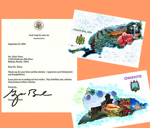 This Cuban calendar I made during January - May 20th 2004 when it was published. I gave one to President Bush when he came to the Miami Arena and he wrote this letter...Many people say it is the "best calendar of Cuba they have seen", "it is a work of ART". It has 175 historical dates and 7 antique songs. It is a collectors' item. Maria, received your beautiful calendar today, 2/4/2005. It is gorgeous, It brought a tear to my eyes as the memories ran through my mind. Thank you again ! Bill Coll My friend Bill passed away in 2006... Previous Next Graphic |
