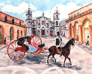 A combination of two subject matter. The Cathedral and the victorian ladies on the carriage, crossing by the Cathedral in Havana, Cuba.