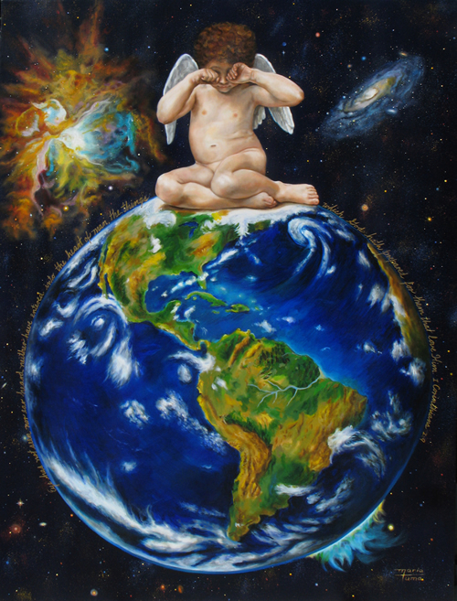 I guess it ties in with the idea... that the cherub cries because people DON'T KNOW what they are missing by not LOVING GOD first and many people on Earth are suffering in every country !
