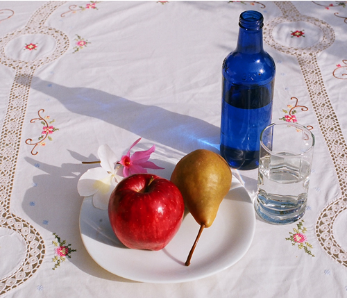 Photography by Maria Tuma. Fotografia pera, manzana y botella azul