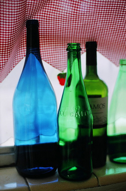 My kitchen window Green and blue glass bottles. Botellas de cristal verdes y azules
