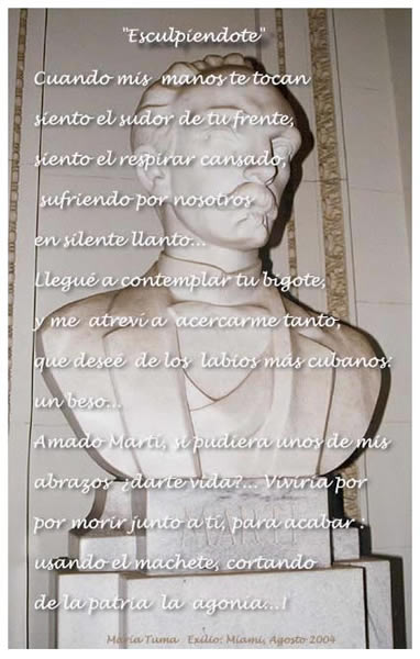 | Escrito mientras hacía su busto en escultura... "ESCULPIENDOTE" Agosto 2004 Cuando mis manos te tocan siento el sudor de tu frente siento el respirar cansado sufriendo por nosotros en silente llanto Llegué a contemplar tu bigote, y me atreví a acercarmetanto, que deseé de los labios más cubanos un beso. Amado Martí, si pudiera uno de mis abrazos ¿darte vida?... Viviría por morir junto a ti, para acabar: usando el machete, cortando de la patria la agonía...! | | "Zapatos Rotos" Dedicado a María Elena Cruz Varela En respuesta a ella por un cometario que me hizo por telefono EXILIO de MIAMI : 7 de marzo de 2005 Estan rotos mis zapatos de caminar tanto, por caminos equivocados... y caminos rectos, limpios, preciosos... (las calles de Jerusalem)... las tierras de Jericó, donde ví uno de Sus tantos milagros! a veces pisé el escremento de un perro... me los limpié en el pasto... y seguí andando, en la manigua de mi patria lejana: exilio de Miami... Me encontré, ricos, pobres, buenos y malos, oportunistas, traidores, patriotas, hermanos y santos... Seguí andando con mis zapatos rotos, miré a mi lado, y veo una botas mambisas, empolvadas por nuestro campo, subí la vista por sus pantalones negros, tambien llenos de la tierra de nuestra campiña, me toma la mano, levanto mis ojos y veo a Martí... me sonrie y me dice: sientate, cambiemos de zapatos, toma tu mis botas, ponte 2 o 3 pares de medias para rellenar el espacio. Mis botas no estan rotas, pero sí estan manchadas aún por mi sangre! a Martí no le sirvieron mis zapatos, los llevaba en la mano como un recuerdo y el siguió descalzo! | TOP of PAGE |